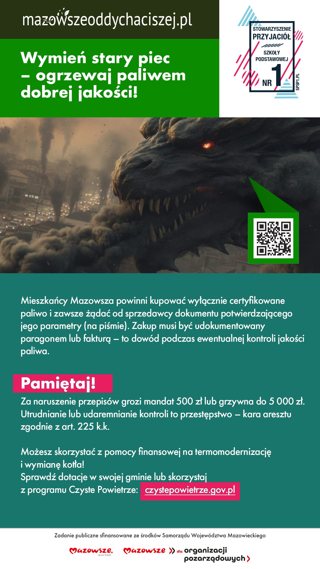 Czyste powietrze zaczyna się od naszych domów. To właśnie dym z przestarzałych pieców i kotłów – tzw. „kopciuchów” – jest jedną z głównych przyczyn smogu na Mazowszu. Oddychanie zanieczyszczonym powietrzem szkodzi każdemu z nas – zwiększa ryzyko chorób płuc, serca i skraca życie. Dlatego tak ważne jest, aby wymieniać stare urządzenia grzewcze i stosować wyłącznie dozwolone, dobrej jakości paliwa.